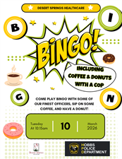 Desert Springs Healthcare is inviting the community to come and play Bingo with our finest local officers, residents, and staff. Enjoy a hot cup of coffee and a sweet donut.